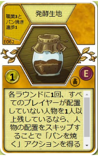| 各ラウンドに1回、すべてのプレイヤーが配置していない人物を1人以上残しているなら、人物の配置をスキップすることで「パンを焼く」アクションを得ることができる。 | |||