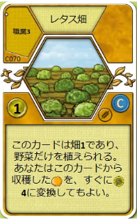 | このカードは畑1であり、野菜だけを植えられる。このカードから収穫した野菜を、すぐに食料4に変換してもよい。 | |||