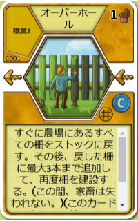 | すぐにすべての柵を戻し、自分のストックから最大3つまでの柵を戻した柵に追加して、再度建設する。(この間、家畜は失われない。)このカードを出したあと、あなたの前に置かず、左隣のプレイヤーの手札に入れる。 | |||