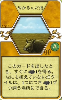 | このカードを出したとき、すぐに猪1を得る。なにも植えていない畑タイルは、1つにつき猪1ずつ飼う場所にできる。 | |||