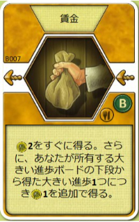 | 食料2をすぐに得る。追加で、あなたが持っている大きい進歩ボードの下段にあった大きい進歩1つにつき食料1をすぐに得る。このカードを出したあと、あなたの前に置かず左隣のプレイヤーの手札に入れる。 | |||