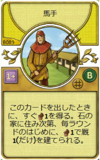 | このカードを出したときに、すぐ木材1を得る。石の家に住み次第、毎ラウンドのはじめに、木材1で厩1(だけ)を建てられる。 | |||