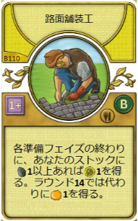 | 各準備フェイズの終わりに、あなたのストックに石材1以上あれば食料1を得る。ラウンド14では食料の代わりに野菜1を得る。 | |||
