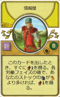 | このカードを出したとき、すぐに木材1を得る。各労働フェイズの後で、あなたのストックの石材がレンガより多ければ、木材1を得る。 | |||