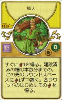 | このカードを出したときすぐに木材1を得る。さらに、この先のラウンドスペースに、すでに建設した柵の本数分先まで木材1ずつ置く。各ラウンドのはじめにその木材を得る。 | |||