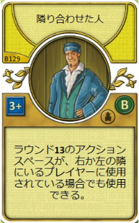 | ラウンドスペース13にあるアクションスペースは、あなたの右隣か左隣のプレイヤーの人物達が占有していても使える。 | |||