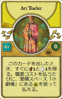 | このカードを出したとき、すぐに木材1と葦1を得る。職業コストを払うたびに、累積スペース「小劇場」にある食料を使って払える。 | |||