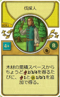 | 木材の累積スペースから木材2/3/4ちょうどを入庫する(ストックに入れる)たびに、木材1と食料1/0/1を追加で得る。 | |||