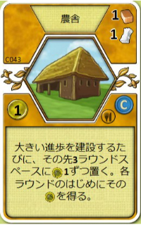 | 大きい進歩を建設するたびに、それ以降の3ラウンドのスペースに食料を1つずつ置く。これらのラウンドのはじめにその食料を得る。 | |||