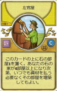 | このカードの上に石の部屋1を置く。石の家4部屋以上になり次第、いつでも資材を支払うことなくその部屋を建築できる。 | |||