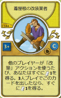 | 他のプレイヤーが改築するたび、あなたはすぐに葦1を得る。3人ゲームでこのカードを出したなら、すぐに葦1を得る。 | |||