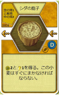| 食料2と小麦1を得る。この小麦はすぐにまかなければならない。このカードは自分の前に置かず、左隣のプレイヤーの手札に入れる。 | |||