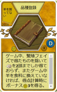 | ゲーム中、繁殖フェイズで得たものを除いて羊を2頭までしか得ておらず、またゲーム中羊を食料に換えていなければ、得点計算時にボーナス3点を得る。 | |||