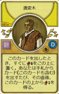 | このカードを出したとき、すぐに木材6をこの上に置く。手札からカード(このカードも含む)を出すたび、その直後、このカードの上から木材1を得る。 | |||