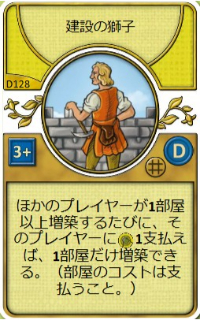 | 他のプレイヤーが1部屋以上建設するたび、あなたはそのプレイヤーに食料1を支払ってすぐにちょうど1部屋だけ建設してもよい。(部屋の建設コストは支払うこと。) | |||