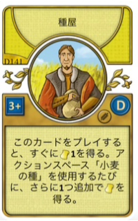 | このカードを出したとき、すぐに小麦1を得る。アクションスペース「小麦の種」を使用するたび、追加で小麦1を得る。 | |||