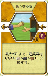 | 最大2回:すぐに建築資材2/3/4を羊/猪/牛1に交換する。このカードは自分の前に置かず、左隣のプレイヤーの手札に入れる。 | |||