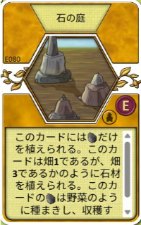 | このカードには石だけを植えられる。このカードは畑1であるが、畑3であるかのように石材を植えられる。このカードの石は野菜のように種まきし、収穫する。 | |||