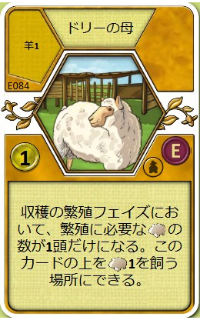 | 収穫の繁殖フェイズにおいて、繁殖に必要な羊の数が1頭だけになる。このカードの上を羊1を飼う場所にできる。 | |||