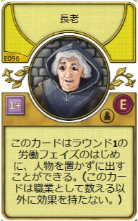 | このカードはラウンド1の労働フェイズのはじめに、人物を置かずに出すことができる。(このカードは職業として数える以外に効果を持たない。) | |||
